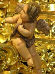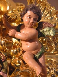 Por otro lado, la urna se remata por un angelito arrodillado en una nubecilla que soporta con sus manos una cruz y un cáliz. Este angelito ocupaba originalmente uno de los cuerpos de la custodia del Corpus Christi procesional de Santiago.