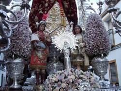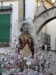 Antes de centrarnos en el actual paso de gloria, merece la pena mencionar al anterior que estuvo en uso hasta la década de los 80 del pasado siglo XX. Ese paso procedía del convento sevillano de la Encarnación de Belén de carmelitas calzadas, que se encontraba al final de la Alameda de Hércules y que fue desamortizado en 1868. Las obras de arte que guardaba este convento fueron repartidas por diversos templos de la provincia hispalense, entre los que se encontraron nuestra parroquia. Corría el año 1869 cuando llegaron a nuestro templo las mencionadas andas que fueron realizadas a mediados del siglo XVIII estando su autoría relacionada con la producción del tallista Tomás Santizo, siendo bastante similar a los realizados para las hermandades sevillanas de la Virgen de la Salud de San Isidoro y la de Valvanera de San Benito.