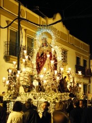 La decoración de los respiraderos se completa con una serie de cabezas de querubines repartidos por toda la obra. En las esquinas, posee el paso cuatro candelabros de guardabrisas con diversos puntos de luz. Los delanteros se alzan de cierta manera para iluminar el rostro de la Virgen y los traseros adoptan la forma de cola para iluminar el manto. Destacan una serie de ángeles, de madera policromada, que revolotean entre los brazos de los candelabros. El eje central del paso es la peana, realizada de igual manera que lo anterior, posee un núcleo central, muy bien decorado con hojas de acanto inversas y motivos geométricos dieciochescos. De este núcleo parten cuatro arbotantes donde apoyan cuatro angelotes a modo de atlantes. Destacar que de esta peana parten dos pequeños candelabros de guardabrisas con tres luces cada uno. Estos, llamados comúnmente “mecheros”, tienen la función de iluminar muy de cerca el rostro de la imagen, sin entorpecer la visión de la misma. Por último destacar que la delantera del paso está presidida por una imagen de plata de la Virgen del Pilar, estrenada en 1999 y donada por nuestro hermano José Veloso Oliver. Para rematar el conjunto, en 1998 se estrenaron lo faldones, realizados en damasco color crudo.