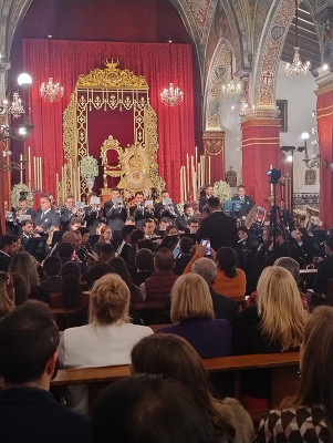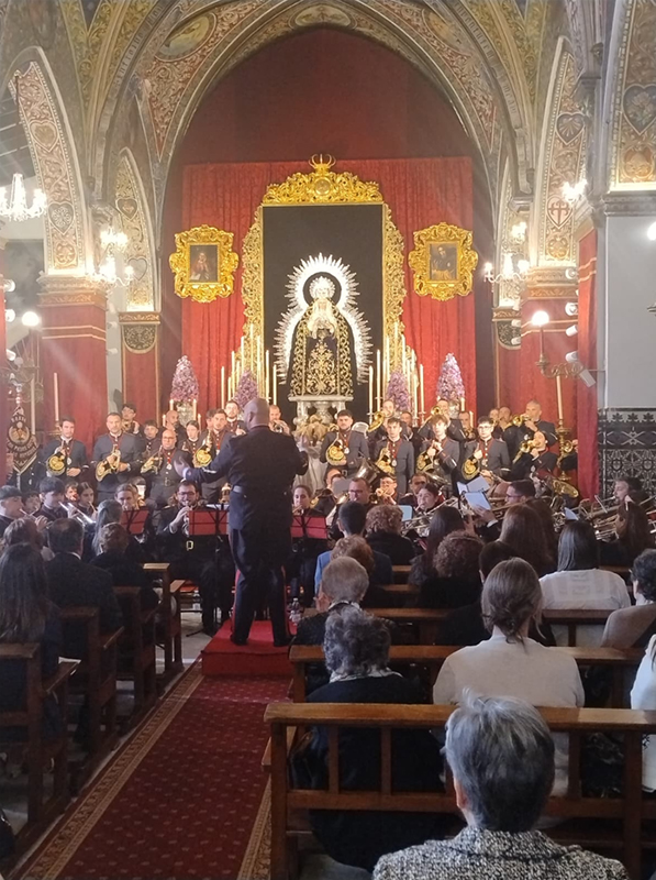 Tras la bienvenida inicial, daban comienzo las interpretaciones por parte de la formación musical, que puso sus sones a las marchas ‘Requiem’, ‘Amor de Madre’, ‘Señor de Sevilla’ y ‘Enmanuel’.