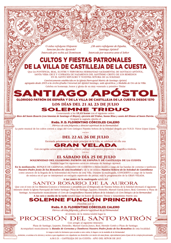 La Pontificia, Real, Ilustre y Fervorosa Hermandad Sacramental de Santiago Apóstol, Santa Vera Cruz y Cofradía de Nazarenos del Santísimo Cristo de los Remedios en el Santo Sepulcro y Nuestra Señora de la Soledad,canónicamente establecida en la Iglesia Parroquial Matriz de Santiago Apóstol; agregada desde 2005 a la Archicofradía Universal del Apóstol Santiago, sede apostólica y Medalla de Oro de la Villa, consagrará en homenaje, honor y gloria de su muy venerado y primitivo Titular, Santiago Apóstol, glorioso Patrón de España y de la villa de Castilleja de la Cuesta desde 1370: