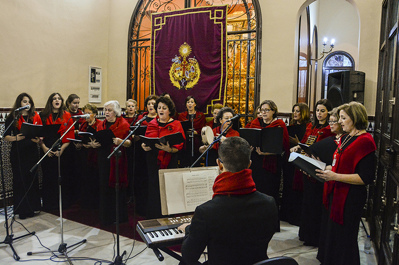 El pasado lunes 26 de diciembre, recién culminada la Solemne Novena de Jornaditas a la Santísima Virgen y a su esposo San José con la Solemnísima Función de la Natividad de Nuestro Señor Jesucristo, el Coro Litúrgico «Nuestra Señora de la Soledad» ofreció un concierto extraordinario navideño en el salón principal de nuestra Casa de Hermandad. Para la ocasión, dicha sede social fue debidamente exornada y preparada con dos centenares de asientos –nuestro agradecimiento a la comisión de la Obra Social y a N.H. Dña. Rosa Luque Tovar por la cesión de parte de los mismos–, así como sonorizada adecuadamente gracias a N.H.D. Fernando López Chaves. Las componentes del coro lucían el uniforme de gala estrenado en la Misa Estacional de Coronación Canónica de la Santísima Virgen de la Soledad.