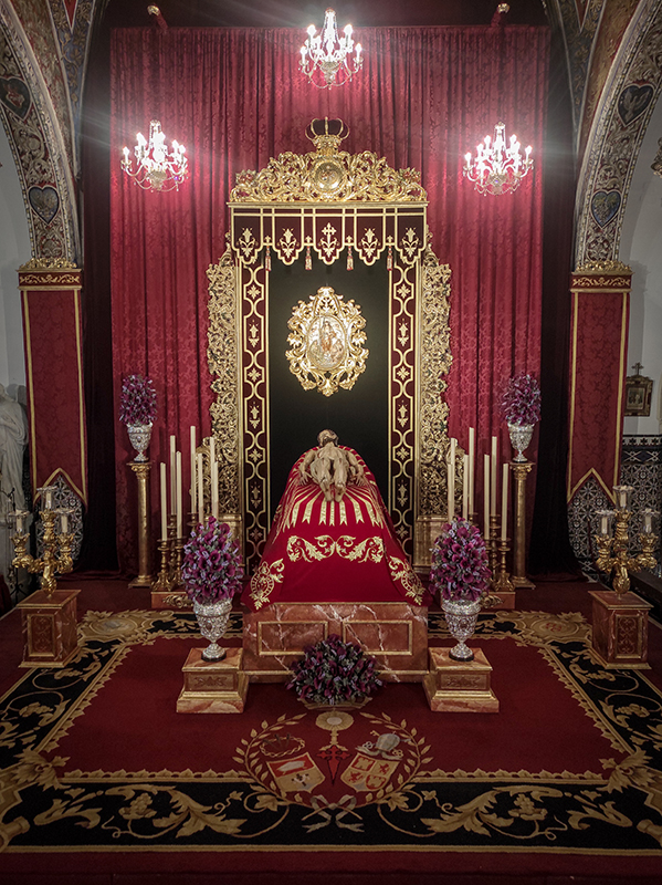 El Señor de Castilleja de la Cuesta se elevaba sobre un túmulo, compuesto por un fondo de altar rojo -bordado en aplicación- cedido por el Apostolado de la Oración, y dispuesto a modo de paño mortuorio.