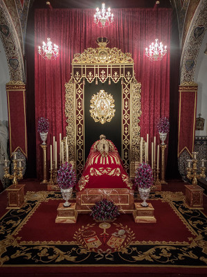 Como fondo de altar encontrábamos piezas del aparato de cultos que conforman el dosel, realizado en madera tallada y dorada, con que cuenta nuestra corporación, en cuyo centro se podía apreciar el antiguo óvalo con las tres virtudes teologales -la Fe, la Esperanza y la Caridad- que presidía en el centro del techo de palio de Nuestra Señora de la Soledad hasta la remodelación del mismo.