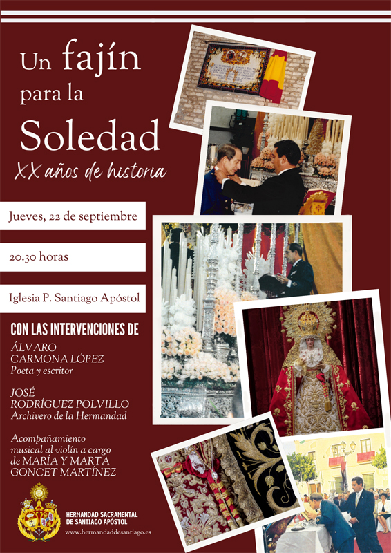 Bajo el título 'Un fajín para la Soledad. XX Años de Historia', la Hermandad Sacramental de Santiago Apóstol de Castilleja de la Cuesta celebra el próximo 22 de septiembre el vigésimo aniversario de la imposición del fajín de Capitán General a Nuestra Señora de la Soledad, uno de los acontecimientos más destacados del pasado reciente de la corporación santiaguista.