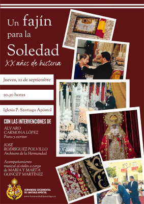 Bajo el título 'Un fajín para la Soledad. XX Años de Historia', la Hermandad Sacramental de Santiago Apóstol de Castilleja de la Cuesta celebró este jueves, 22 de septiembre, el vigésimo aniversario de la imposición del fajín de Capitán General a Nuestra Señora de la Soledad, un acontecimiento que tuvo una importantísima repercusión en la localidad y del que ahora se cumplen dos décadas.