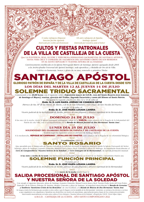 Celebra del 12 al 25 de julio los Cultos y Fiestas Patronales de la Villa de Castilleja de la Cuesta en homenaje, honor y gloria de su muy venerado y primitivo Titular, SANTIAGO APÓSTOL. Glorioso Patrón de España y de la villa de Castilleja de la Cuesta desde 1370