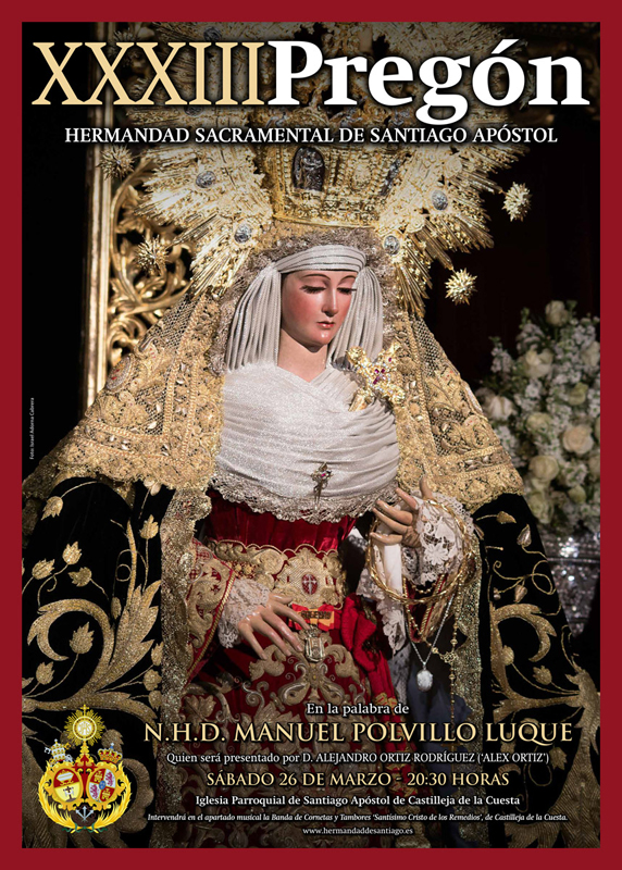 Este sábado, 26 de marzo, a las 20.30 horas el templo parroquial santiaguista de Castilleja de la Cuesta acogerá la XXXIII edición del Pregón de la Hermandad Sacramental de Santiago Apóstol, decano de la Villa, que en esta ocasión correrá a cargo de N.H.D. Manuel Polvillo Luque.
