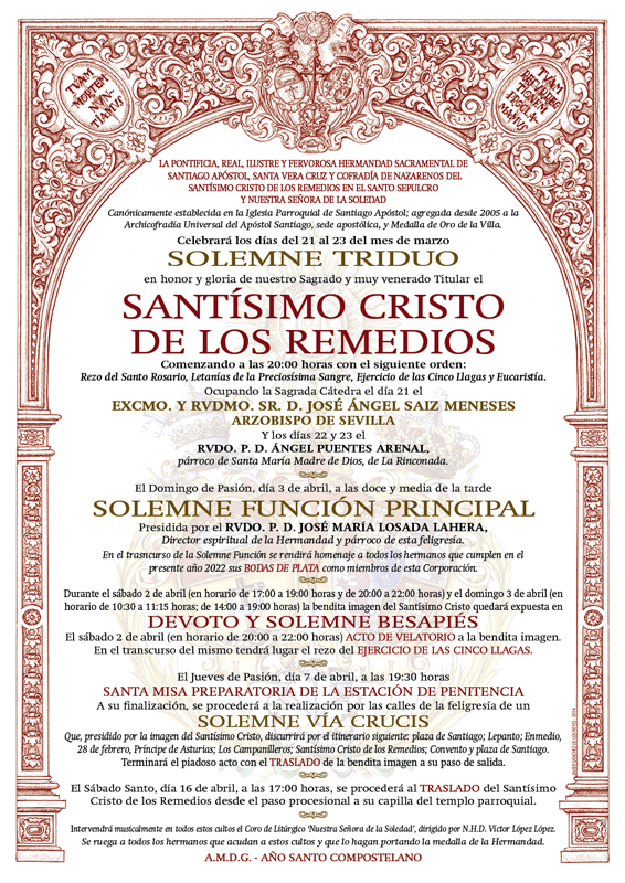 La Pontificia, Real, Ilustre y Fervorosa Hermandad Sacramental de Santiago Apóstol, Santa Vera Cruz y Cofradía de Nazarenos del Santísimo Cristo de los Remedios en el Santo Sepulcro y Nuestra Señora de la Soledad, canónicamente establecida en la Iglesia Parroquial de Santiago Apóstol; agregada desde 2005 a la Archicofradía Universal del Apóstol Santiago, sede apostólica y Medalla de Oro de la Villa, celebrará los días del 21 al 23 de marzo del mes de marzo Solemne Triduo en honor y gloria de nuestro Sagrado y muy venerado Titular el Santísimo Cristo de los Remedios.