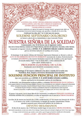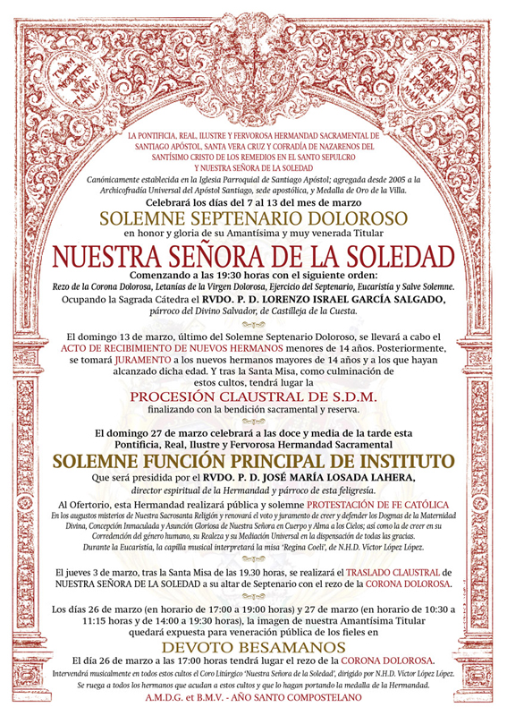 La Pontificia, Real, Ilustre y Fervorosa Hermandad Sacramental de Santiago Apóstol, Santa Vera Cruz y Cofradía de Nazarenos del Santísimo Cristo de los Remedios en el Santo Sepulcro y Nuestra Señora de la Soledad, canónicamente establecida en la Iglesia Parroquial de Santiago Apóstol; agregada desde 2005 a la Archicofradía Universal del Apóstol Santiago, sede apostólica y Medalla de Oro de la Villa, celebrará los días del 7 al 13 del mes de marzo, Solemne Septenario Doloroso en honor y gloria de su Amantísima y muy venerada Titular, Nuestra Señora de la Soledad, comenzando a las 19:30 horas con el siguiente orden: rezo de la Corona Dolorosa, Letanías de la Virgen Dolorosa, Ejercicio del Septenario y Eucaristía y Salve solemne. Ocupará la Sagrada Cátedra el Rvdo. P. D. Lorenzo Israel García Salgado, párroco del Divino Salvador, de Castilleja de la Cuesta.
