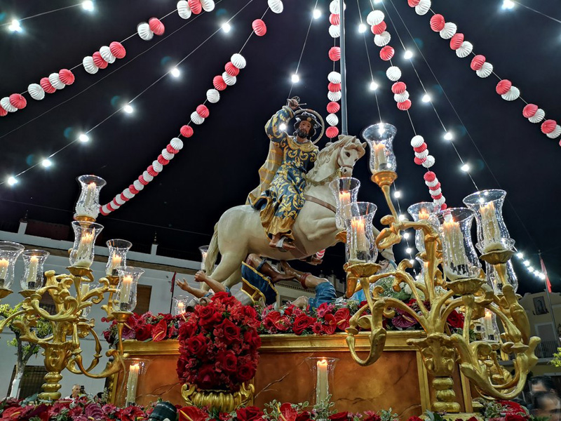 Pasadas las 21.45 horas, y tras la Solemne Función Principal, daba comienzo la procesión en honor del apóstol, talla de principios del siglo XIX atribuida a Juan de Astorga y representada en su iconografía ecuestre. El exorno floral del paso corrió a cargo de 'Añil, arte floral y decoración', estando integrado en esta ocasión por rosas, astromelias, anthuriums y margaritas, conformando un conjunto de gran vistosidad.