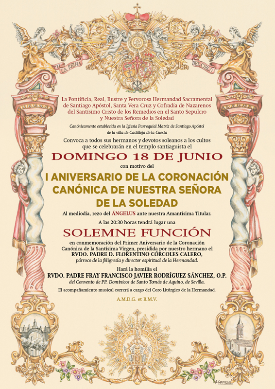 La Pontificia, Real, Ilustre y Fervorosa Hermandad Sacramental de Santiago Apóstol, Santa Vera Cruz y Cofradía de Nazarenos del Santísimo Cristo de los Remedios en el Santo Sepulcro y Nuestra Señora de la Soledad, canónicamente establecida en la Iglesia Parroquial Matriz de Santiago Apóstol de Castilleja de la Cuesta, convoca a todos sus hermanos y devotos soleanos a los cultos que se celebrarán en el templo santiaguista el domingo 18 de junio con motivo del I ANIVERSARIO DE LA CORONACIÓN CANÓNICA DE NUESTRA SEÑORA DE LA SOLEDAD.