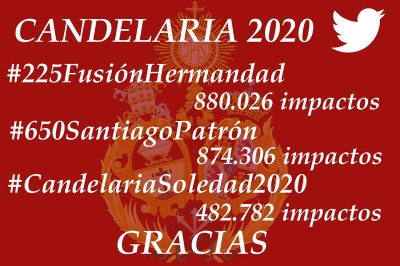 Cerca de 900.000 impactos han logrado en los últimos días en la red social Twitter las etiquetas #650SantiagoPatrón y #225FusiónHermandad, promovidas por la Hermandad Sacramental de Santiago Apóstol para el seguimiento de los cultos en torno a la festividad de la Candelaria, incluidos en las celebraciones de la doble efeméride que conmemora la corporación santiaguista en este 2020.