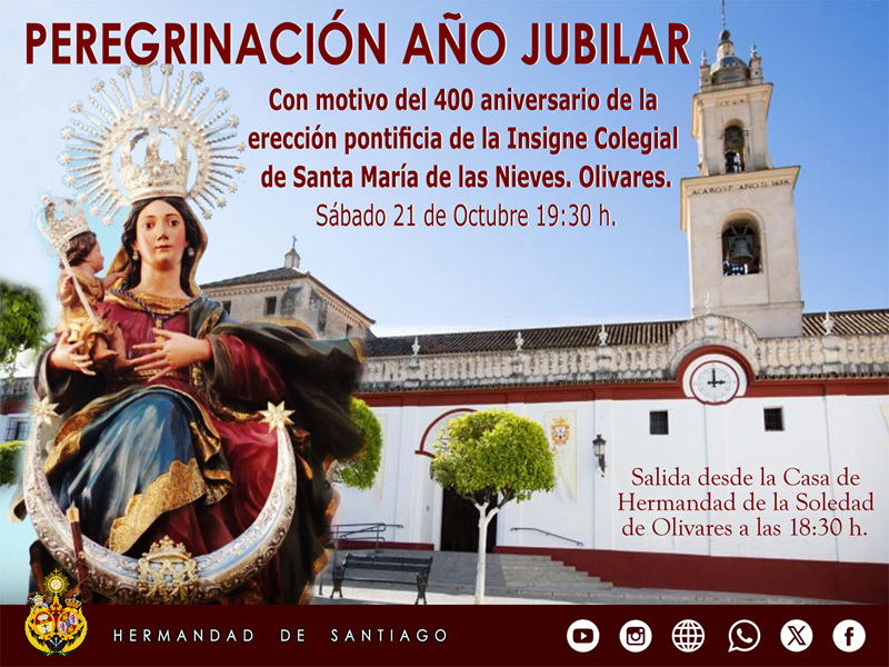 Para el próximo sábado, 21 de octubre, nuestra Hermandad Sacramental de Santiago Apóstol organiza la peregrinación su segunda anual a un templo jubilar. En esta ocasión tomamos como destino la histórica parroquia del vecino municipio de Olivares, inmersa en el 400 Aniversario de su erección y dedicación a Santa María de las Nieves, Patrona de la localidad.