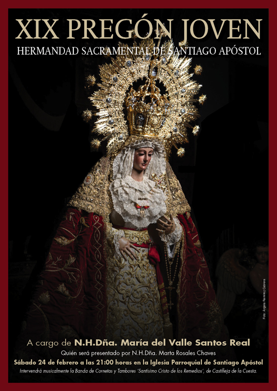 Este próximo sábado, 24 de febrero, N.H.Dña. María del Valle Santos Real pronunciará el XIX Pregón Joven de la Hermandad, una cita que tendrá lugar en la iglesia parroquial santiaguista de Castilleja de la Cuesta a las 21.00 horas.