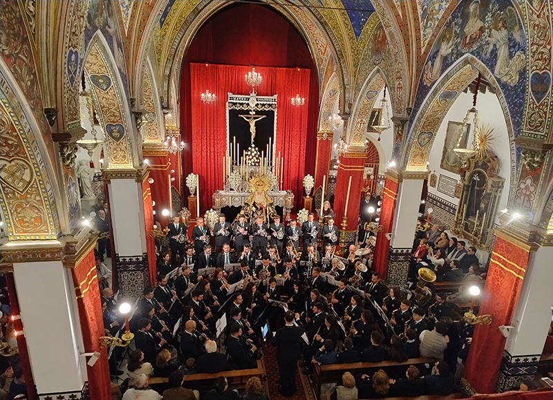 El concierto continuó después con ‘Regla de las Almas (Francisco Jesús Lozano y José Colomé, 2021), ‘Himno a Nuestra Señora de la Soledad’ (Víctor López López, 2016), ‘La Virgen de las Angustias’ (David Hurtado Torres, 2020), ‘Luz en la Soledad’ (Óscar Navarro González, 2010) y ‘Se arrodilla Triana (David Hurtado Torres, 2019). En este sentido, cabe destacar la presencia en el concierto del compositor David Hurtado Torres, quien recibió también el aplauso de todos los presentes tras la interpretación de sus dos marchas incluidas en el repertorio de la noche.