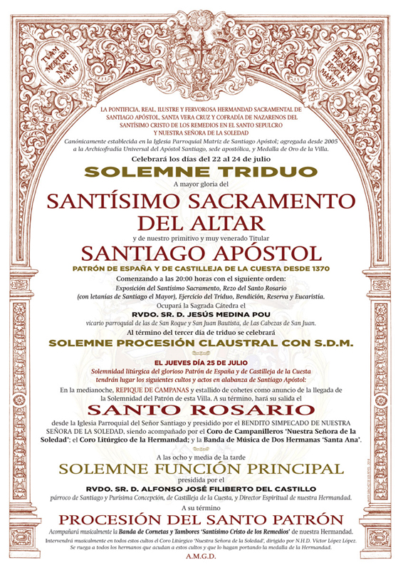 Solemne Triduo a mayor gloria del Santísimo Sacramento del Altar y de nuestro primitivo y muy venerado Titular Santiago Apóstol. Del 22 al 24 de julio.
