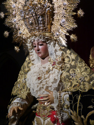 Un vestido de raso morado, un rostro del Señor para la Verónica 104 reales; un fleco de oro entrefino para el manto negro de la Virgen de la Soledad costó 720 reales.