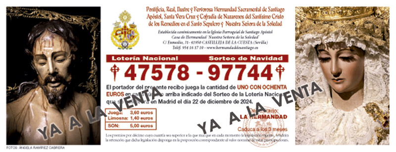 La Hermandad Sacramental de Santiago Apóstol vuelve a poner a disposición de los hermanos y devotos, un año más, los números de la LOTERÍA DE NAVIDAD 2024.