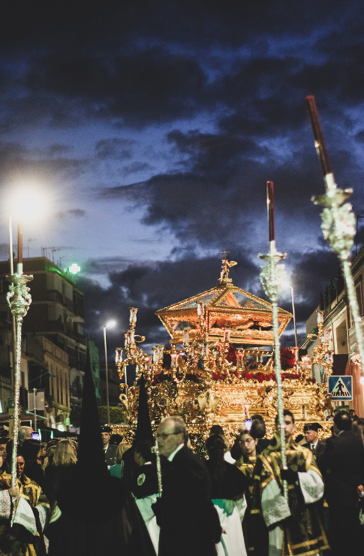 Tras la Cruz de guía, nazarenos de terciopelo negro con la cruz de Santiago al pecho formaban la comitiva fúnebre que precedía al paso procesional del Santo Sepulcro. Iban las andas procesionales hermosamente dispuestas con rosas rojas colombianas, hypericum holandés y eucalipto cinerea, todo ello alumbrado por cera roja en sus candelabros. La Banda de Cornetas y Tambores “Santísimo Cristo de los Remedios” acompañó magistralmente el paso del Señor.
