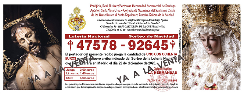 La Hermandad Sacramental de Santiago Apóstol vuelve a poner a disposición de los hermanos y devotos, un año más, los números de la LOTERÍA DE NAVIDAD 2025.