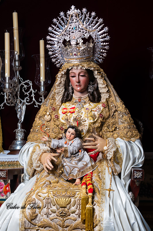 El altar dispuesto para la ocasión quedó presidido por las sagradas imágenes de la Virgen y el Niño, sedente sobre peana cedida por la Hermandad de la Vera Cruz de Salteras, bajo dosel formado con el aparato de cultos de la Hermandad y como fondo sobre resplandor dorado la representación del Espíritu Santo. Dos candelabros plateados y jarras con flores blancas escoltaban a la imagen. Igualmente dos consolas con jarritas contenían dos hermosos relicarios con símbolos marianos cedidos por D. Ezequiel García Muñiz.