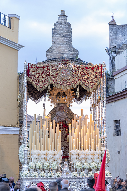 DATOS DE INTERÉS: La imagen del Santísimo Cristo de los Remedios es obra atribuida al quehacer de Marcelino Roldán hacia principios del siglo XVIII; procesiona, en el Santo Sepulcro, paso de Antonio Roldán de 1912. La Virgen de la Soledad es una obra anónima del XVI. Luce saya negra bordada en oro fino sobre terciopelo de Lyon negro, es la saya más antigua que posee la Santísima Virgen, su pago se efectuó el día 20 de agosto de 1815, alcanzando la suma de 560 reales. Pasado el oro a nuevo terciopelo en 1986 por el bordador Benjamín Pérez de Bollullos de la Mitación. Diez años después fue enriquecida acertadamente por el mismo bordador. El manto de la Virgen es una portentosa obra de las Hermanas Antúnez (1889-1890). Toca de sobremanto bordada en en el taller de Elena Caro bajo el diseño de N.H.D. Alfonso Chaves en los años 60 del siglo XX; en su paso se combinan obras de prestigiosos orfebres. El palio, bajo diseño del ceramista Juan Oliver Míguez, es un compendio del trabajo de diversos y afamados talleres de bordados y orfebrería. En el presente año se cumple el décimo aniversario de la Coronación Canónica de nuestra titular con la corona ‘Grandiosa’, obra del afamado orfebre Fernando Marmolejo Camargo, labrada en 1944. Además, la Santísima Virgen posee en su ajuar numerosas sayas bordadas.