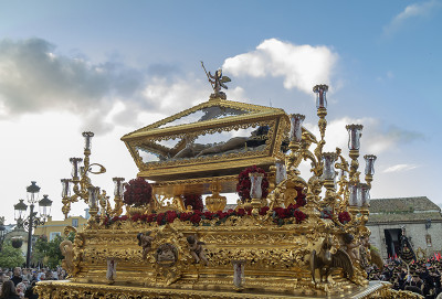 ESTRENOS: Este año se estrena las jarras del paso de gloria realizadas por el taller de Orfebrería Andaluza, así como la limpieza de bambalinas, profusamente bordados en oro fino sobre terciopelo granate, en el taller de Javier Asencio Cisneros.