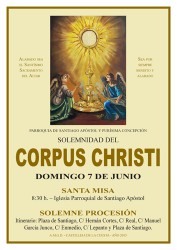 El próximo domingo 7 de junio, Solemnidad Litúrgica del Cuerpo y la Sangre de Nuestro Señor Jesucristo, tendrá lugar la Procesión del Corpus Christi organizada por la Parroquia de Santiago Apóstol y Purísima Concepción. Estarán representadas en la misma las dos hermandades sacramentales de la Villa, además de los diversos grupos parroquiales.