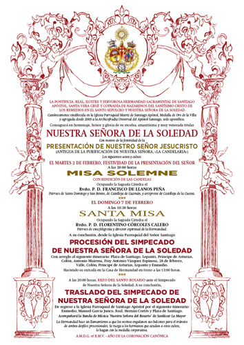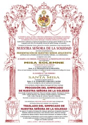 Consagrará en homenaje, honor y gloria de su excelsa, amantísima y muy venerada titular, NUESTRA SEÑORA DE LA SOLEDAD, con motivo de la Festividad de la Presentación de Nuestro Señor Jesucristo (Antigua de la Purificación de Nuestra Señora, «La Candelaria») los siguientes actos y cultos: