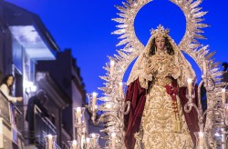 Ya por la tarde, a las ocho daba comienzo la procesión de Gloria de Nuestra Señora de la Soledad, este año, y como el pasado Viernes Santo, sin su corona, luciendo una diadema color plata, junto a las ráfagas de Resurrección y un manto de terciopelo rojo que hacía las veces del tradicional manto bordado rojo y oro. El paso iba bellamente exornado con alelíes. Por su parte, el cortejo iba formado por la cruz sacramental, dos faroles, estandarte y dos varas, presidencia, cuerpo de ciriales e incensarios y paso procesional. Las andas procesionales de la Santísima Virgen iban comandadas un año más por Luis León Pérez y acompañadas musicalmente, al igual que el Viernes Santo, por la Banda de Música de Dos Hermanas ‘Santa Ana’. Al igual que en la Estación de Penitencia, la formación nazarena interpretó un muy acertado repertorio de marchas procesionales. El recorrido discurrió por las calles Plaza de Santiago (suprimiendo acertadamente en la salida su realización íntegra para ganar tiempo), Lepanto, Enmedio, 28 de febrero, Alegría, Convento, Real (hasta esquina con Virgen del Loreto), Convento y Plaza de Santiago. Entre numerosos vítores y aplausos la Señora hizo entrada en el templo a las 0:05 horas poniendo el broche de oro a la Semana Santa 2016 en nuestra localidad.