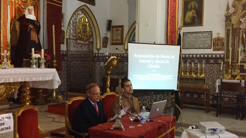 El último en intervenir fue el protagonista de la restauración, el joven escultor licenciado en Bellas Artes por la Universidad de Sevilla, Pablo Lanchares. Apoyándose en la exposición de diversas fotografías, realizó un pormenorizado análisis del proceso de restauración de las santas. Así, el escultor leonés señaló que “la intervención llevada a cabo en las imágenes de María Salomé y María Cleofás ha consistido fundamentalmente en la consolidación y limpieza de la policromía original, así como en la adecuación de los sistemas de soporte, con el fin de devolver a las mismas el aspecto más original posible al que lucieron en el último cuarto del siglo XIX”.
