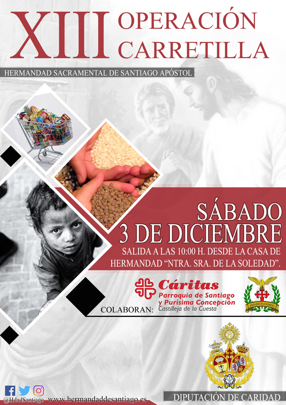 La Hermandad Sacramental de Santiago Apóstol, a través de su Diputación de Caridad y en colaboración con Cáritas Parroquial de Santiago y Purísima Concepción, celebrará el próximo sábado 3 de diciembre su XIII Operación Carretilla. Como es tradicional, los alimentos colectados se destinarán a dicho grupo parroquial para su correcta redistribución entre las personas más desfavorecidas de nuestra localidad.