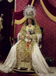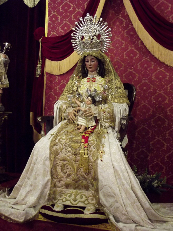 La imagen de Nuestra Señora portaba muchas de las joyas que le fueron donadas con motivo de su reciente Coronación Canónica, luciendo algunas sobre el pecherín bordado en oro y otras en el borde de la toca, mientras que sobre sus sienes lucía la corona de plata adornada con algunas preseas.