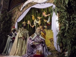 Mientras, en el portal quedaron dispuestos los tres Reyes Magos y San José, con vistosos ropajes, el altar presidido por Nuestra Señora de la Soledad se instaló ante el retablo de Santiago como de costumbre. Cobijada bajo unos grandes cortinajes rojos y el dosel y bambalina propiedad de nuestra corporación, se mostraba sedente la imagen de Nuestra Señora con el Niño en su regazo, en su antiguo trono con apliques de plata. Vestidas completamente de blanco ambas imágenes, la Virgen lucía manto de brocado y saya bordada en oro sobre tisú con su fajín de teniente general y zapatos de igual color, apoyando sus pies en un cojín rojo. Quedaba a un lado, en otro cojín, el cetro de la Virgen, símbolo de su realeza.