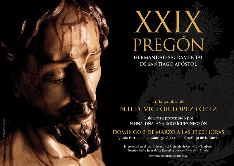 El día 5 de marzo, primer domingo de Cuaresma, a las 13:00 horas, esta Pontificia, Real, Ilustre y Fervorosa Hermandad Sacramental de Santiago Apóstol, Santa Vera Cruz y Cofradía de Nazarenos del Santísimo Cristo de los Remedios en el Santo Sepulcro y Nuestra Señora de la Soledad celebrará en la Iglesia Parroquial de Santiago Apóstol su XXIX Pregón como preámbulo al inicio de los Cultos Cuaresmales, Semana Santa y Pascua de Resurrección.
