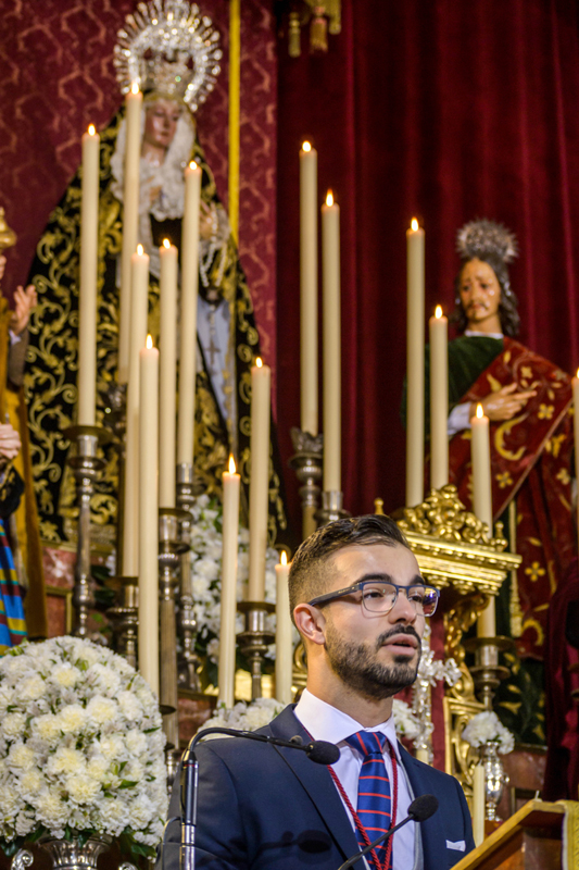 Sería N.H.Dña. Ana Rodríguez Negrón la encargada, por designación del pregonero, de presentarlo. Repasando su perfil biográfico y profesional, con su presentación remarcó la profunda fe de Víctor mediante unas palabras que denotaban los fuertes lazos de amistad que los unen, lazos que vienen dados de su implicación activa con el coro litúrgico de la corporación. Desde su nacimiento en Villarrasa (Huelva) hasta su llegada a nuestra hermandad, Ana desveló para todos una curiosa anécdota por la que nuestro hermano Víctor quedó prendado de la imagen de Nuestra Señora de la Soledad, decidiendo desde entonces entrar a formar parte de su nómina de hermanos, siempre acogido por un grupo de hermanos que sigue conservando orgullosamente como destacados amigos en la actualidad.