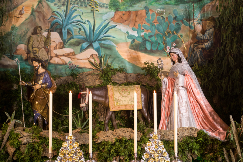 Para ello, cada día, la Virgen de la Soledad, titular de su Corporación, aparece acompañada de San José en una etapa de este viaje, motivo por el que se cambia la escena y la indumentaria de la Virgen a diario, y así aparece caminando junto a San José al lado de una mula, sentada sobre el animal, descansando vestida de pastora, sentada junto a una fogata, junto a un pozo, llamando a una posada, para culminar la noche del 25 en el portal de Belén junto a su Hijo Jesús recién nacido.