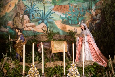 “Enseres pertenecientes a la Jornada: Un telón de gran tamaño con paisajes al óleo. Una saya de raso de seda lisa color rosa. Dos mantos, uno grana y otro azul. Un frontal blanco y amarillo con ramos de flores (muy antiguo). Tres ovejas de pasta. Un medio punto de corcho con techo de lienzo, pintado figurando rocas y dos cortinas de tul. Un paño de púlpito de seda con ramos. Un palio del Santísimo de terciopelo blanco con ramos pintados y ocho varas de madera pintadas en grana. Ocho túnicas de ángeles, cuatro bordadas en oro y cuatro de tisú de plata”.