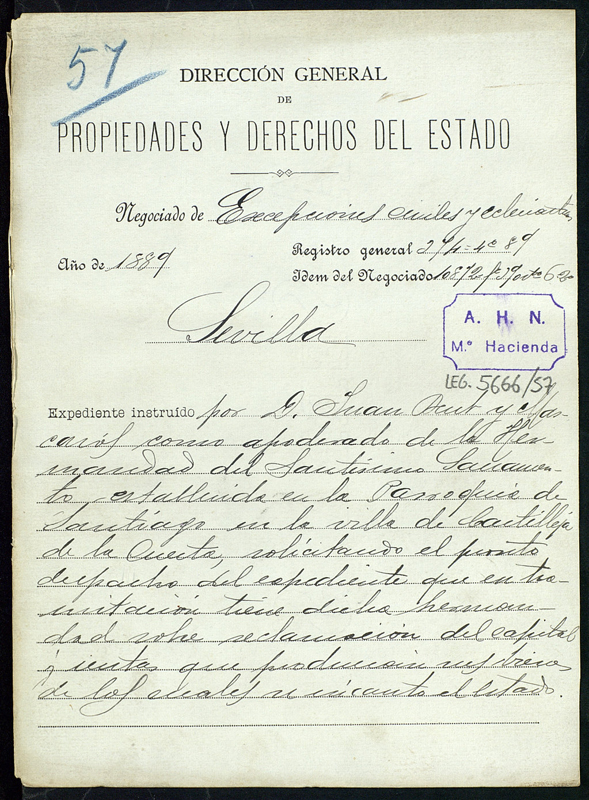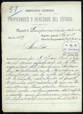 Se trata de un expediente completo integrado por 50 folios e instruido por la Dirección General de Propiedades y Derechos del Estado, dependiente del Ministerio de Hacienda, una documentación conservada en el Archivo Histórico Nacional.