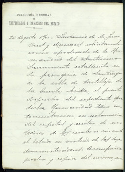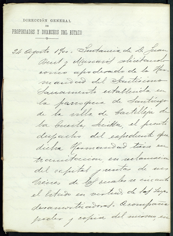 La primera anotación recogida en el expediente tiene fecha de 24 de agosto de 1900 y se refiere a la instancia presentada ante la citada Dirección General por parte de Juan Becet y Mascarós como “apoderado de la Hermandad del Santísimo Sacramento establecida en la parroquia de Santiago de la villa de Castilleja de la Cuesta, Sevilla”, en la que solicita “el pronto despacho del expediente que dicha Hermandad tiene en tramitación en reclamación del capital y rentas de sus bienes de los cuales se incautó el Estado en virtud de las leyes desamortizadoras”.