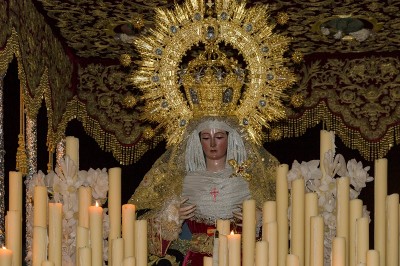 Aún con los sones de nuestra banda musitando la muerte de Cristo, apuramos la espera para sentir la pena de Nuestra Señora. Atraviesa portentosa el dintel de la puerta para arropar nuestras lágrimas con su manto. La banda nazarena recuerda el sonido del aire en la Coronación de Nuestra Señora de la Soledad y por momentos volvemos a sentir el perfume de ese grandioso día.