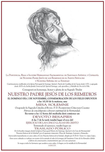 Este próximo domingo 2 de noviembre, coincidiendo con la Conmemoración de los Fieles Difuntos, a las 10.30 horas nuestra Hermandad celebrará Misa Solemne en homenaje, honor y gloria a Nuestro Padre Jesús de los Remedios. Ocupará la Sagrada Cátedra nuestro párroco y director espiritual, don Florentino Córcoles Calero