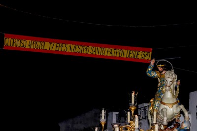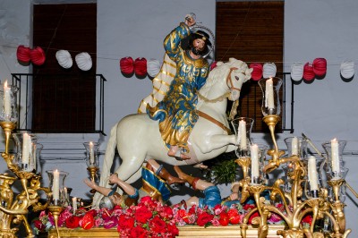 Pasadas las 21.45 horas, y tras la Solemne Función Principal, daba comienzo la procesión en honor del apóstol, talla de principios del siglo XIX atribuida a Juan de Astorga y representada en su iconografía ecuestre. El exorno floral del paso corrió a cargo de 'Añil, arte floral y decoración', estando integrado en esta ocasión por rosas, astromelias, anthuriums y margaritas, conformando un conjunto de gran vistosidad.