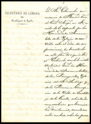 El documento, hasta ahora en propiedad de un particular, está fechado el 6 de septiembre de 1870, consta de siete páginas y presenta el membrete de la Secretaría de Cámara del Arzobispado de Sevilla, estando firmado por el entonces Gobernador de la institución, Francisco Cabero.