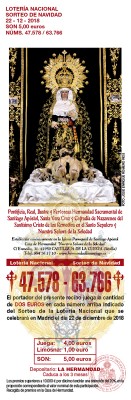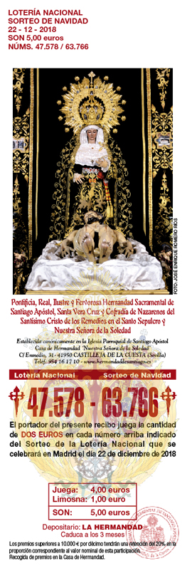 La Hermandad Sacramental de Santiago Apóstol vuelve a poner a disposición de los hermanos y devotos, un año más y ante la cercanía de las fechas que se avecinan, los números de la LOTERÍA DE NAVIDAD 2018.