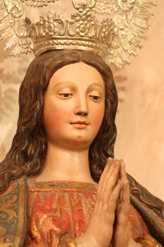 La escultura mide 1,09 m, y representa a la Virgen María muy joven, casi niña, arrodillada, embarazada, en postura frontal y estática, con las manos unidas en señal de adoración, de forma semejante a como se suele representar la Inmaculada, y portando en su vientre un pequeño relicario donde se halla una diminuta figura del Niño Jesús de plata, aunque el original no se conserva. El rostro de la Virgen es ovalado, con cuello esbelto, frente despejada, boca pequeña cerrada, hoyuelo en la barbilla y párpados caídos, que otorgan a la imagen una sensación de recogimiento, destacando además la longitud de su cabellera, cuyos individualizados y largos mechones ondulados , parten de una raya central y caen por la espalda y los hombros hasta la cintura. La Virgen viste una saya de color rojizo de escasos pliegues verticales ceñida a la cintura por un estrecho cíngulo tallado de color verde, ricamente estofada con motivos vegetales y tallos de perfil geométrico, que rodean un anagrama mariano central; la envuelve un amplio manto de color verde que le cubre los hombros, semejando como dice Pacheco, “una capa de coro”, que presenta igualmente un suntuoso estofado, a base de "ces" sinuosas y tallos vegetales, en tonos blancos y rojizos. Se trata por tanto de una obra de tradición escultórica manierista, un estilo que encaja perfectamente con el misterio que representa [5].