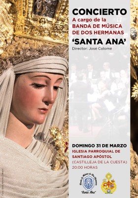 Como venía siendo tradicional, la Banda de Música de Dos Hermanas 'Santa Ana' pondrá con sus sones el broche de oro al solemne besamanos de Nuestra Señora de la Soledad el próximo domingo 31 de marzo. La mencionada formación ofrecerá un concierto de marchas procesionales en la Iglesia Parroquial de Santiago Apóstol a partir de las 20:00 horas.