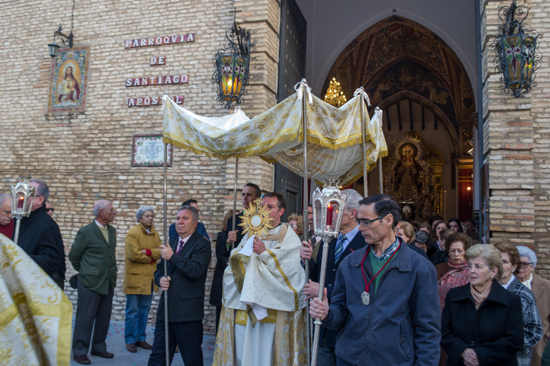 Ya a las 7:30 horas dio comienzo en el templo parroquial matriz la Solemne Función presidida por el Rvdo. P. D. José María Losada Lahera, párroco y director espiritual de nuestra corporación, corriendo a cargo del coro litúrgico de la hermandad el acompañamiento musical en dicha función. Seguidamente y como es antigua costumbre, recorriendo la plaza de Santiago procesionó bajo palio el Santísimo Sacramento acompañado por un cortejo formado por algunos cirios e insignias, realizándose algunas de las tradicionales estaciones en los altares efímeros instalados al efecto a lo largo del itinerario. Finalizada la procesión, se impartió la bendición eucarística y se reservó el Santísimo en el Sagrario.