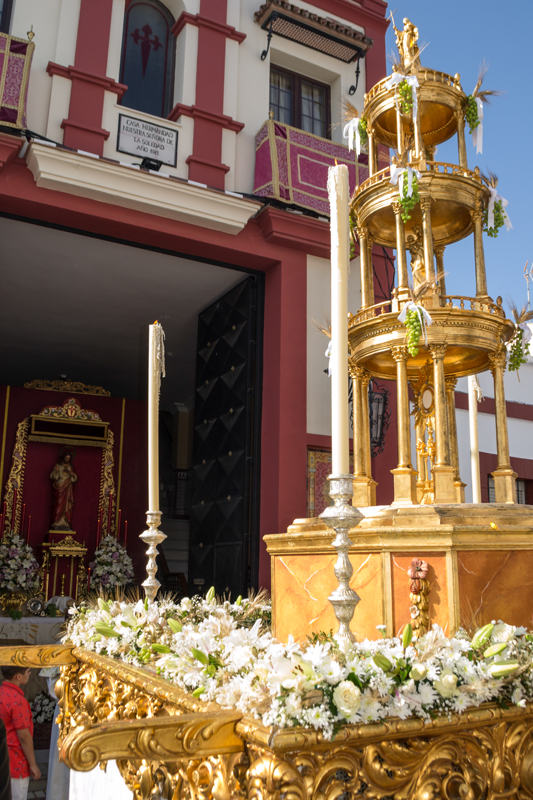 Finalizada la comunión, el sacerdote entronizó al Santísimo Sacramento en el paso de la custodia, decorosamente exornado con rosas, astromelias, liliums, estatices, margaritas, paniculata, uvas y espigas de trigo, en alusión al misterio de la Eucaristía. Seguidamente, cuando faltaban pocos minutos para las nueve de la mañana, se inició la procesión eucarística, cuyo cortejo encabezaba la cruz parroquial y a la que seguían las diferentes representaciones citadas con sus estandartes y varas y un nutrido número de componentes de cada uno de ellos portando cirios. Cerraban la procesión el paso de Su Divina Majestad, antecedido por el cuerpo de acólitos y comandado por Ramón Samper y Esteban Manuel López, el palio de respeto y, finalmente, la Corporación Municipal. El acompañamiento musical corrió a cargo de la Agrupación Musical ‘María Inmaculada’ de nuestra localidad.